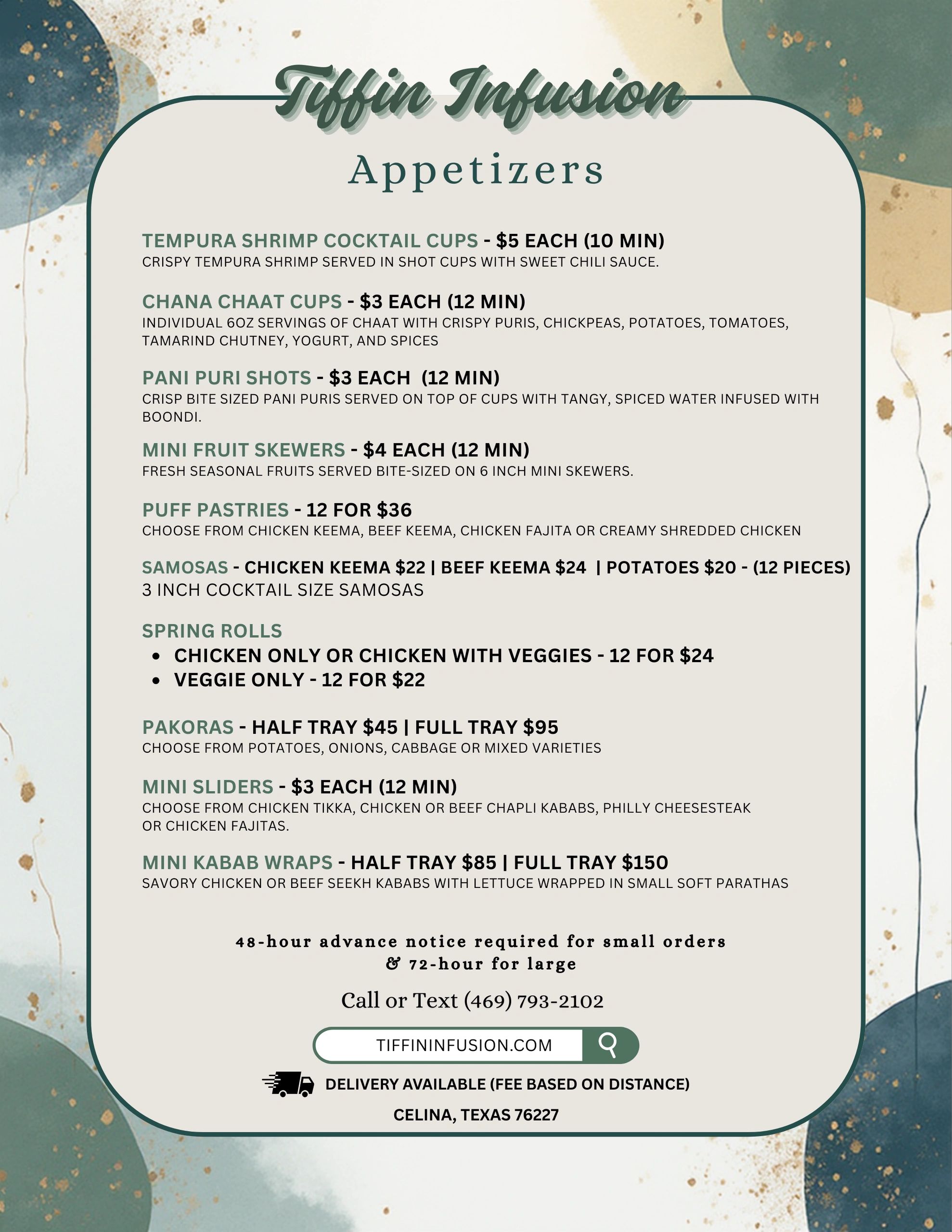 Our party appetizers menu with pricing